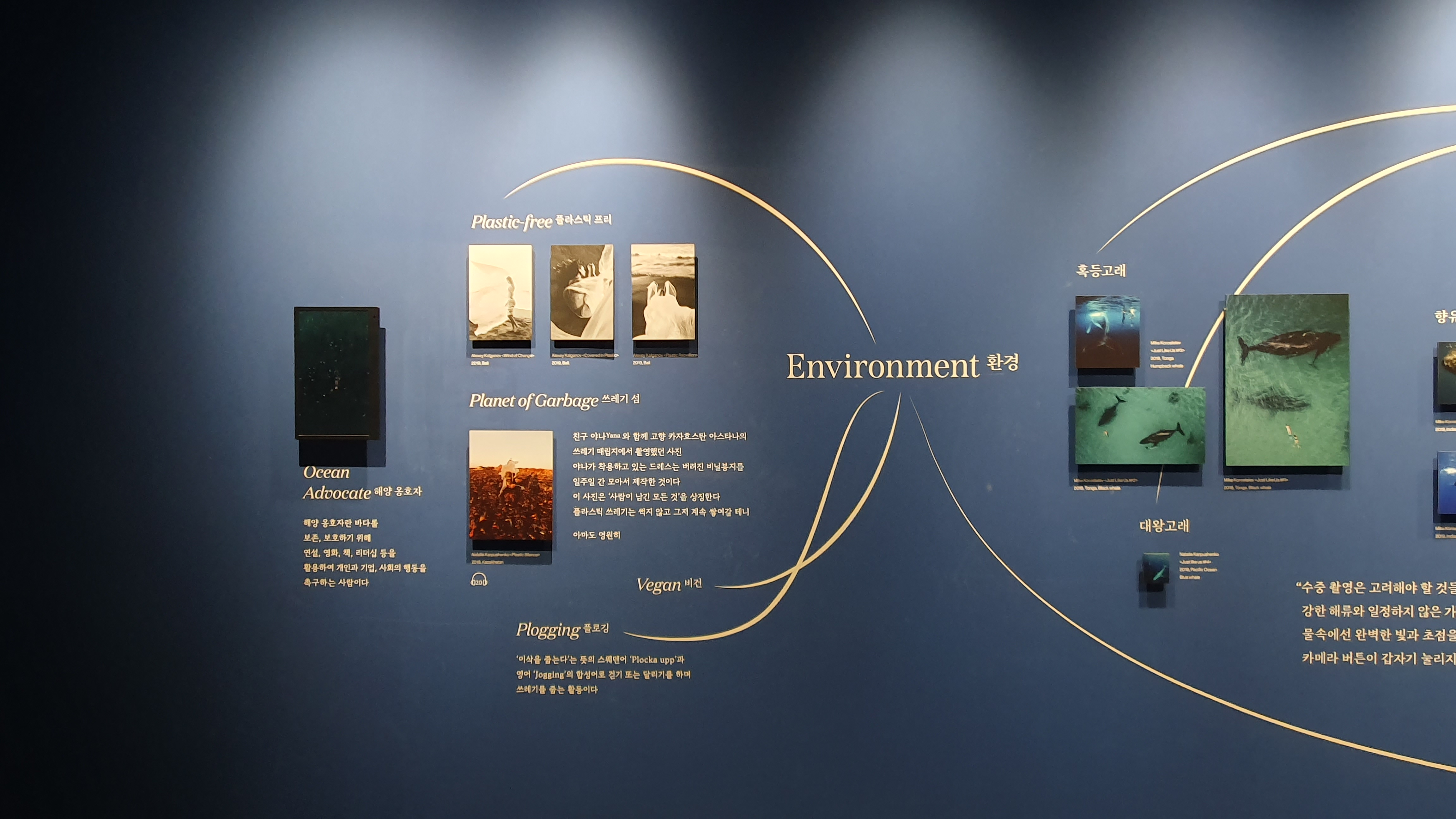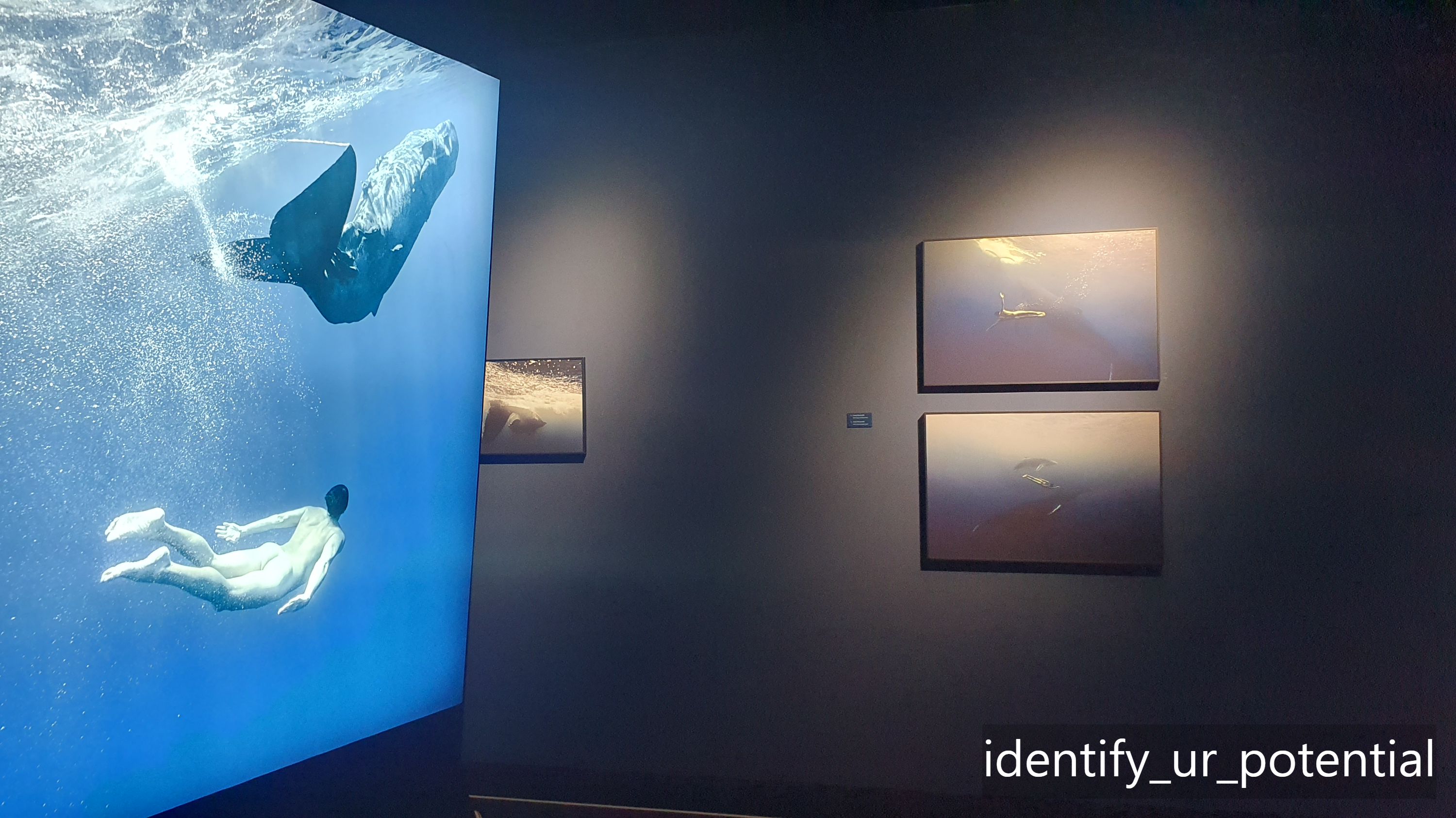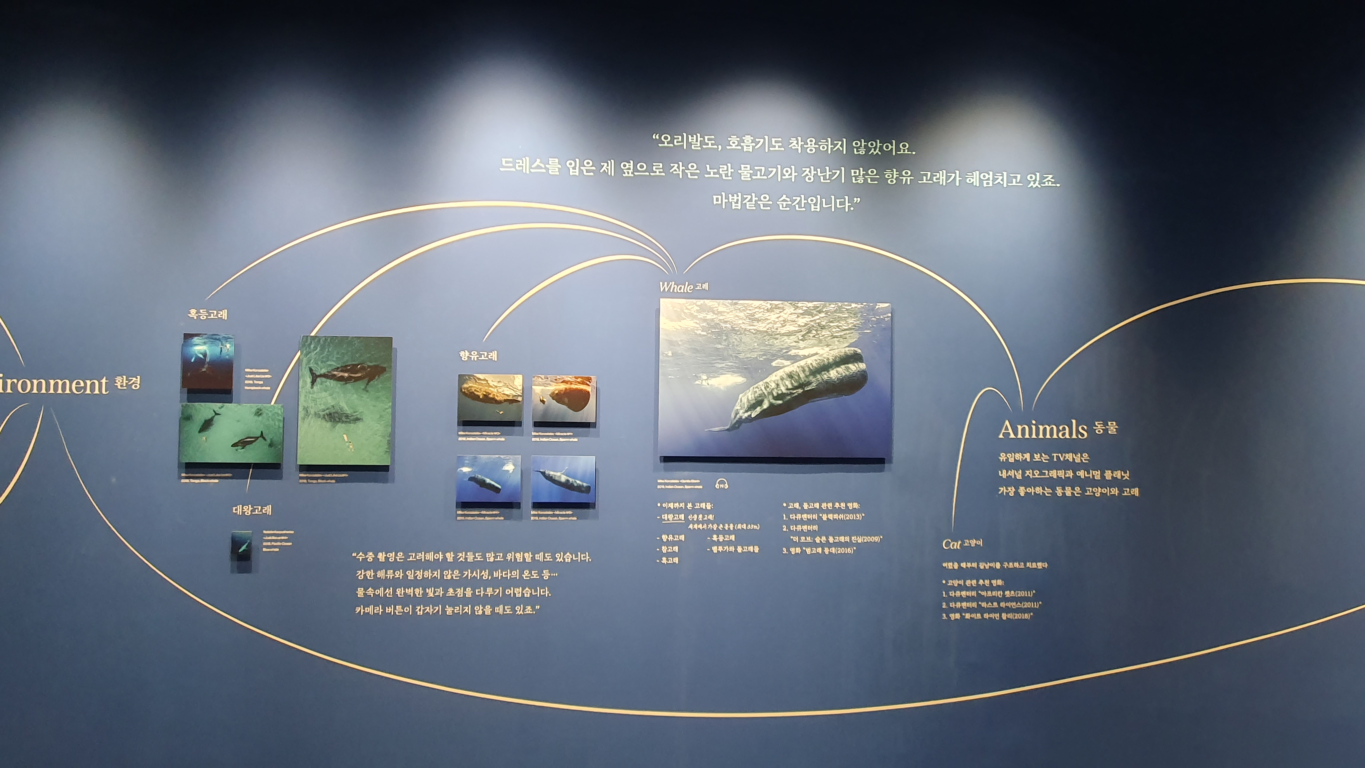 푸른색상의 벽이 마음을 차분하게 만들어주고, 평온함을 느낄 수 있는 섹션이었어요. 고래와 인간이 자유로이 유영하는 아름다운 바다가 가장 기억에 남아요.