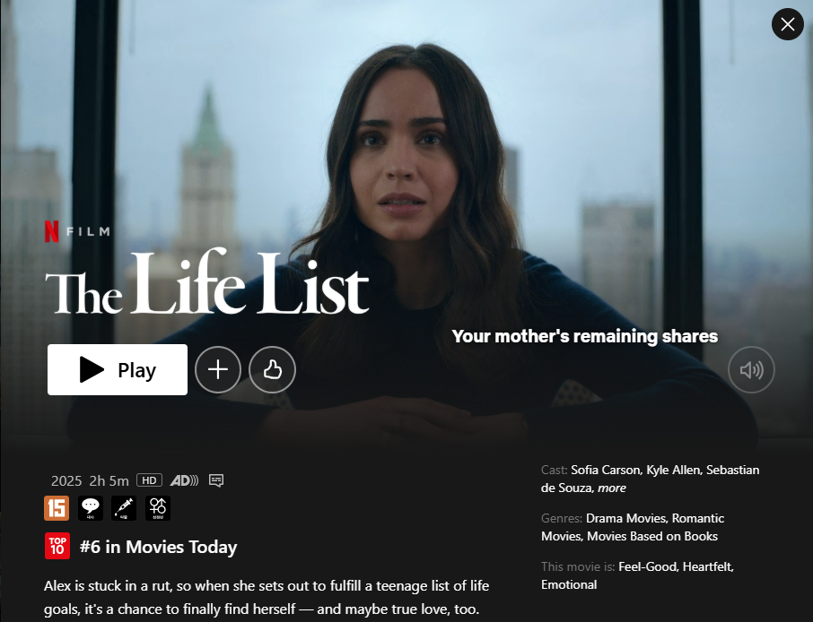 The Life List는 단순한 로맨스 영화가 아닙니다. 삶의 방향, 사랑의 본질, 그리고 나다운 삶에 대해 생각하게 만드는 깊이 있는 영화입니다.