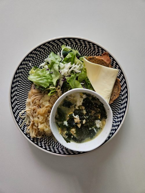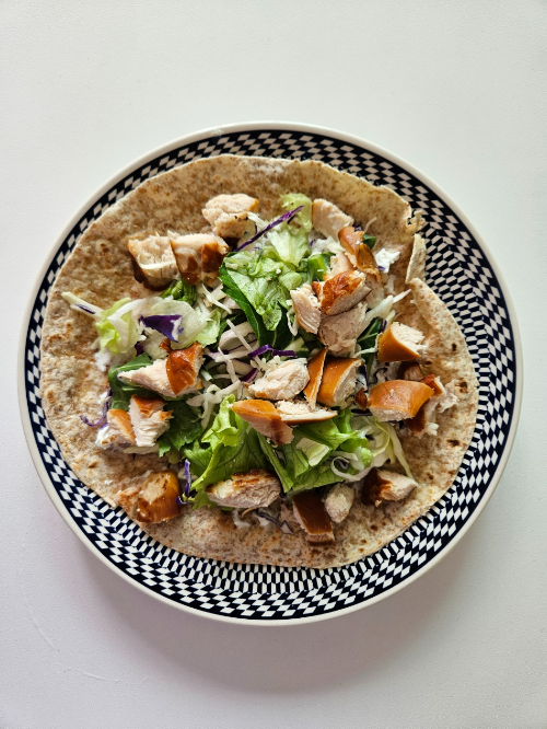 - 마지막으로 또띠아 위에 샐러드와 닭가슴살 올려주면 완성!